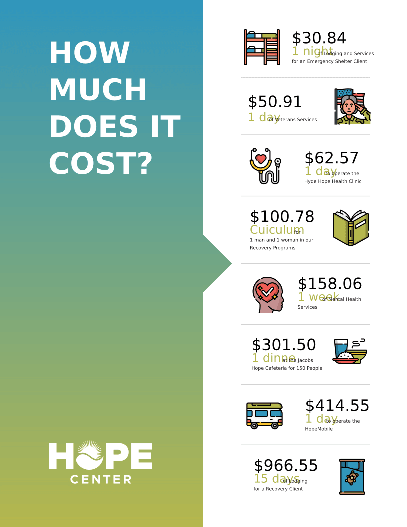 A gift to the Hope Center can mean the difference between a roof over someone’s head or a night on the street, between a hot meal or going hungry, between a day of sobriety or another day chasing the next fix. Please consider making a financial donation via the form on the right. Your generosity has made our work possible.